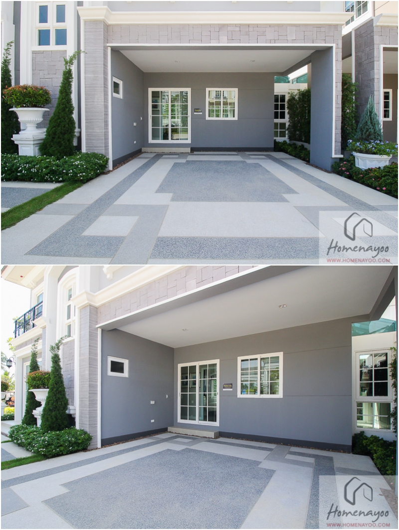 เรามาดูรายละเอียดของตัวบ้านกันไปทีละส่วนๆกัน เริ่มที่พื้นที่หน้าบ้านจะแยกเป็นที่จอดรถขนาด 2 จอดทางขวามือและประตูทางเข้าหลักหน้าบ้านทางซ้ายมือ