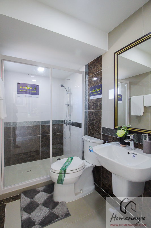 ความโดดเด่นของโครงการอีกข้อก็คือวัสดุที่ทางโครงการได้เลือกใช้ ภายในห้องน้ำมีการคัดสรรกระเบื้องหลายชนิดมาใช้ตกแต่งผนังห้องดูสวยงามหรูหรา ซึ่งอีกหลายๆ โครงการจะไม่ค่อยได้ตกแต่งอะไรมาให้สักเท่าไหร่ และภายในโซน Shower มีการก่อธรณีขึ้นมาเพื่อแบ่งส่วนเปียกและส่วนแห้งออกจากกันอย่างชัดเจน พร้อมติดฉากกั้นอาบน้ำให้ทุกห้อง