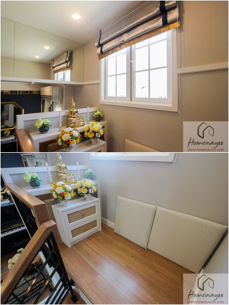 พื้นที่บนห้องพระจัดเป็นมุมสงบๆเล็กๆ สามารถวางโต๊ะหมู่บูชาได้ พร้อมพื้นที่นั่งสงบจิตใจ ด้านบนมีช่องแสงเป็นหน้าต่างบานกระทุ้ง 2 บาน