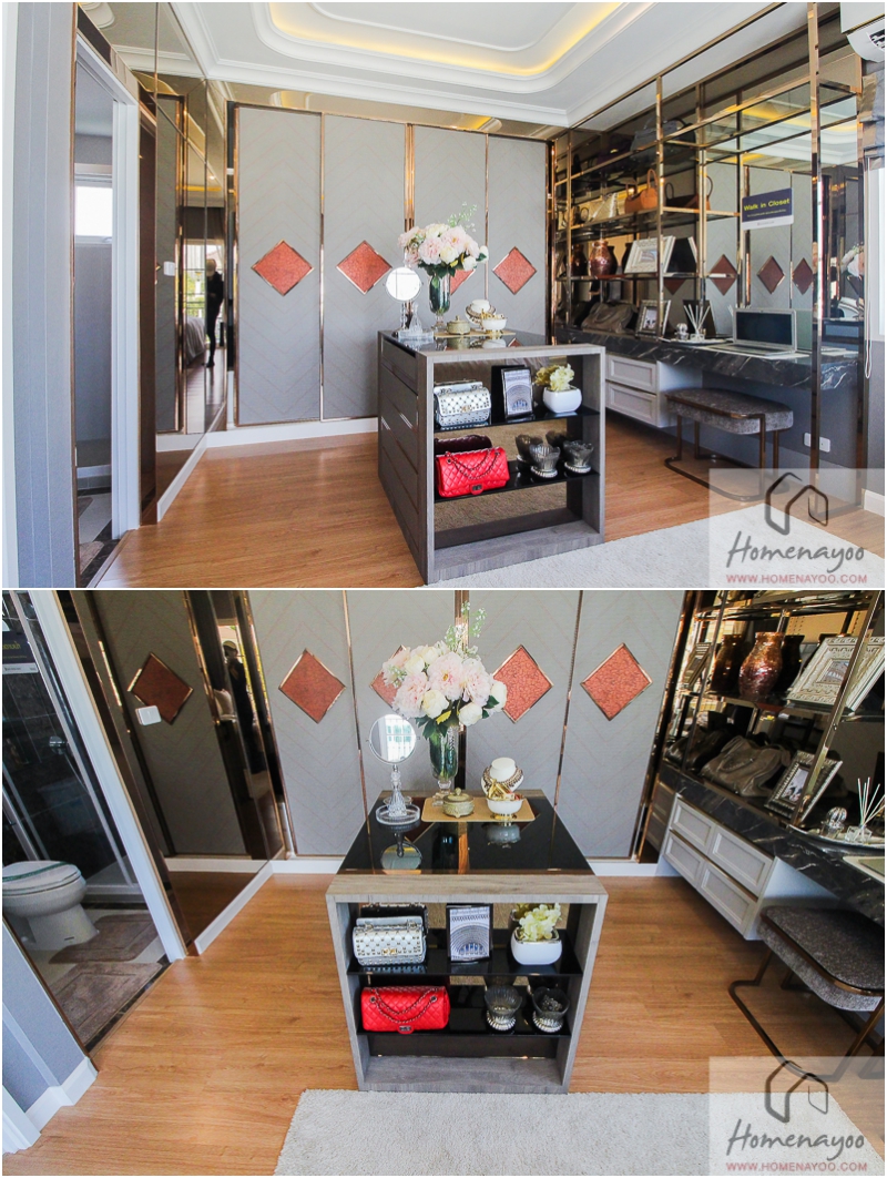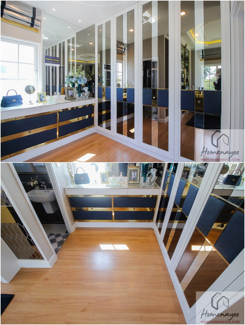 พื้นที่ส่วน Walk – in Closet ถือว่ากว้างเลยทีเดียวนะคะ สามารถติดตั้งตู้เสื้อผ้าหลังใหญ่ๆได้เลย และมีพื้นที่ให้ยืนแต่งตัวค่อนข้างกว้างด้วย