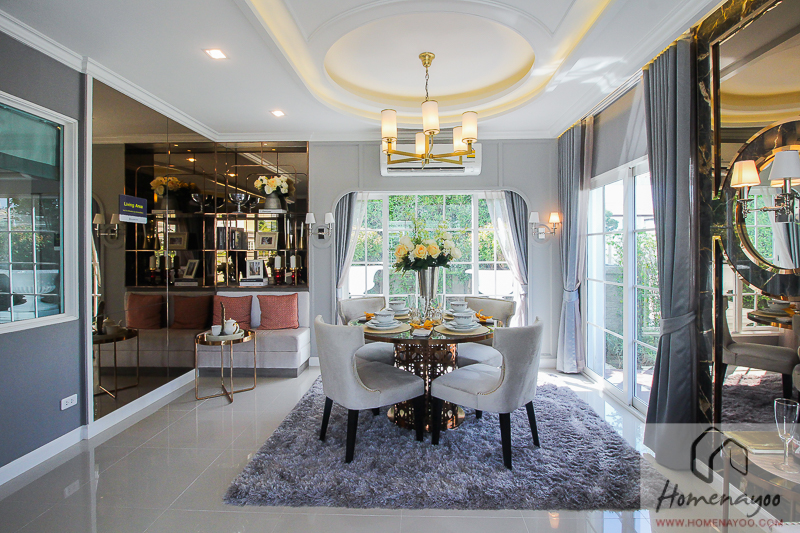 เนื่องจากห้องในบ้านมาตรฐานจะเป้นพื้นที่โล่งๆ ส่วนตกแต่งทั้งหมดที่เราเห็นอยู่จะไม่มได้มีมาให้ด้วย เพราะฉะนั้นขนาดห้องทานอาหารจึงมีพื้นที่ค่อนข้างกว้างขวาง สามารถวางโต๊ะทานอาหารและยงมีพื้นที่เหลือให้อีกฝั่งสามารถวางเคาน์เตอร์แพนทรี่สำหรับเตรียมอาหารว่างหรือบาร์สำหรับเครื่องดื่มได้อีก