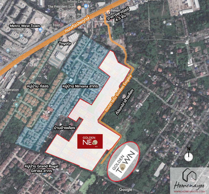 โครงการ Golden Neo สาทร ตั้งอยู่ภายในที่ดินผืนใหญ่ของ Golden Empire สาทร ซึ่งทางเข้าจะตั้งอยู่ติดถนนกัลปพฤกษ์ แล้วตัวโครงการจะอยู่ถัดเข้ามาจากทางเข้าติดถนนกัลปพฤกษ์อีกประมาณ 300 เมตร ซึ่งจากถนนกัลปพฤกษ์ที่เชื่อมเข้ามาในโครงการจะเป็นถนนภาระจำยอมภายใน Golden Empire ทำให้บรรยากาศในโครงการมีความสงบและเป็นส่วนตัวค่อนข้างสูงค่ะ ส่วนสภาพแวดล้อมในวงกว้างบนถนนกัลปพฤกษ์นี้จะค่อนข้างคึกคัก มีทั้งที่อยู่อาศัยแนวราบราคาสูง, คอนโด และส่วนพาณิชย์เกิดขึ้นมากมาย