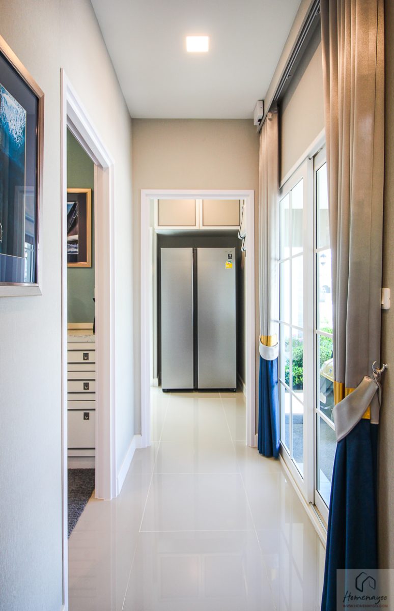 ติดกับห้องน้ำมีประตูกระจกบานเลื่อน เดินเชื่อมออกไปที่จอดรถได้ ซ้ายมือจะเป็นห้องนอน 4 ตรงหน้าเป็นห้องครัว