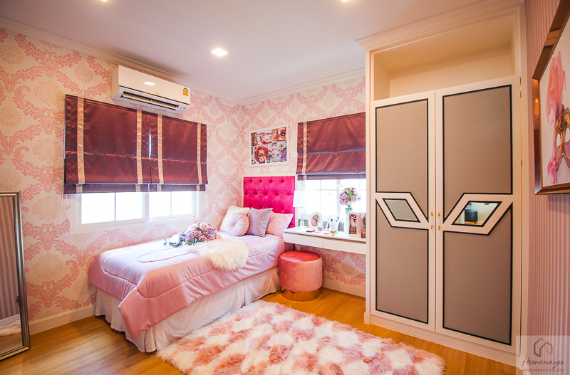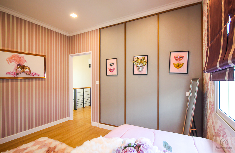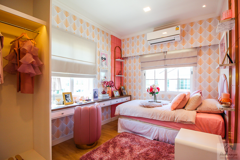 หน้าห้องน้ำมีพื้นที่ไว้ให้ทำ Walk in closet ได้ มีพื้นที่ให้ประมาณ 2.9 x 2.9 ม. บ้านตัวอย่างทำตู้เสื้อผ้าขนาดใหญ่มาให้ดู พร้อมโต๊ะเครื่องแป้ง