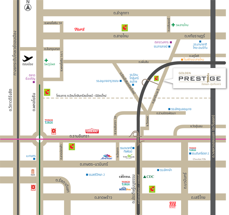 ♦ ทำเลที่ตั้งโครงการ :โครงการ โกลเด้น เพรสทีจ วัชรพล-สุขาภิบาล 5 นั้นตั้งอยู่ติดถนนสุขาภิบาล 5 ตามชื่อเลยค่ะ เป็นถนนที่เชื่อมต่อออกไปได้หลายเส้นทาง มีซอยเล็กซอยน้อยให้ลัดเลาะเยอะ ถนนเส้นหลักที่อยู่ใกล้ๆจะมีถนนสายไหม รามอินทรา พหลโยธิน นอกจากนี้จุดเด่นสำคัญของโครงการคืออยู่ใกล้จุดขึ้นลงทางด่วนรามอินทราอาจณรงค์และมอเตอร์เวย์ ทำให้เข้าเมืองออกเมืองได้สะดวกนั่นเอง
