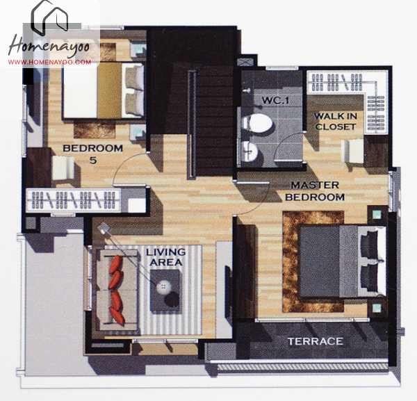 ผังชั้น 2 จะแบ่งออกเป็นสองส่วนหลักๆ คือ ครึ่งซ้ายฝั่งหน้าบ้านจะเป็นส่วนของ Living Area ส่วนฝั่งหลังบ้านจะเป็นห้องนอนเล็ก ที่มีห้องน้ำในตัว, ส่วนครึ่งขวาทั้งแถบ จะเป็นห้อง Master Bedroom ที่จริงๆแล้วกินพื้นที่เกินครึ่งของชั้นสองไปแล้ว ภายในห้อง Master Bedroom จะมีห้องน้ำในตัว, มีพื้นที่สำหรับห้องแต่งตัว (Walk-in Closet) และ Studio เล็กๆ สำหรับนั่งทำงาน หรือเป็นพื้นที่เอนกประสงค์ เป็นห้องที่สร้างพื้นที่ส่วนตัวได้ดีเหมาะสำหรับเจ้าของห้องที่เป็นคู่แต่งงานค่ะ