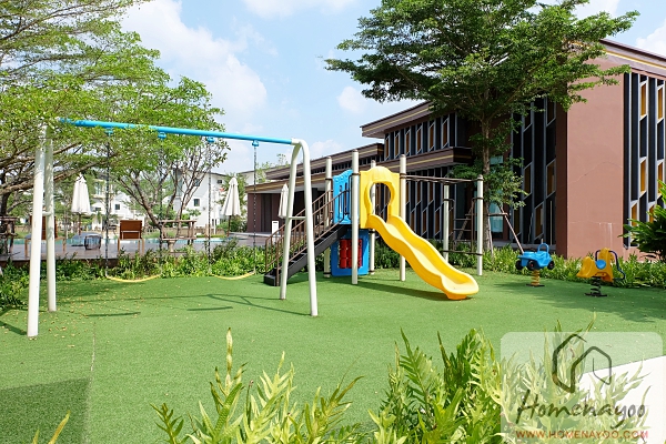 สวนด้านข้างของอาคารสโมสร จะมีสนามเด็กเล่นกลางแจ้ง ที่อยู่บนพื้นหญ้าซึ่งอันนี้ดีนะคะ เวลาเด็กๆเล่นแล้วล้มก็ไม่เจ็บมากเหมือนพื้นคอนกรีต