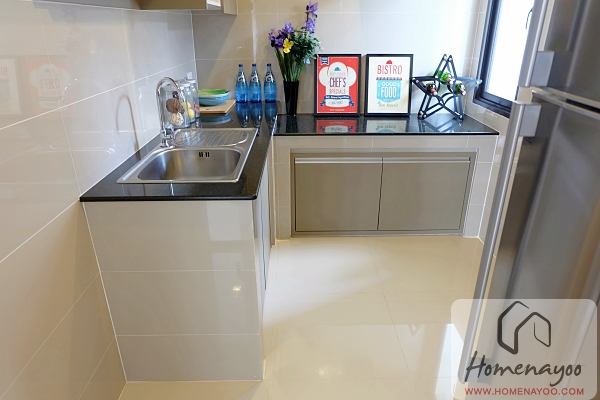 ในห้องครัวจะก่อชุดครัวมาให้ รูปทรงอย่างที่เห็นในบ้านตัวอย่างค่ะ แต่จะไม่มีบานปิดมาให้นะคะ อันนี้สามารถติดตั้งเพิ่มเองทีหลังได้ค่ะ ผนังห้องครัวเป็นกระเบื้องได้ตามที่เห็นค่ะ ทำให้เช็ดล้างทำความสะอาดได้ง่าย