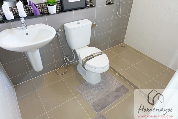 ห้องน้ำลดระดับจากพื้นห้องนอนประมาณ 5 ซม. พื้นห้องน้ำส่วนแห้งเป็นกระเบื้องเซรามิกขนาด 30 x 30 เซนติเมตร
