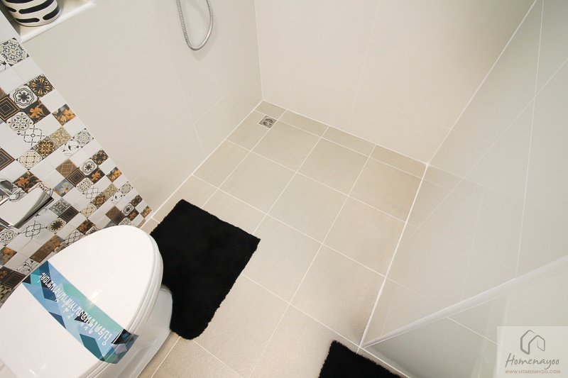 พื้นที่โซนอาบน้ำจะกว้างขวางมากขึ้น พร้อมก่อธรณีกันน้ำไหลย้อนและติด Shower Box แบบบานเฟี้ยม 2 ตอนให้เรียบร้อย