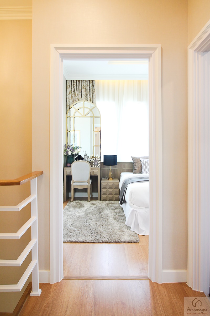 มาดูที่ห้องนอนใหญ่กันต่อ เป็นห้องที่อยู่ฝั่งซ้ายของโถงบันได ส่วนวัสดุประตูห้องนอนชั้นบนก็จะเหมือนกับห้องนอนชั้นล่างค่ะ