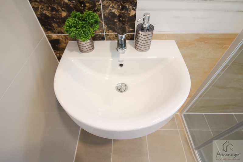 อ่างล้างมือจะเป็นแบบแขวนผนัง มีฝาครอบท่อดักกลิ่นให้เรียบร้อย พร้อมกระจกเงา