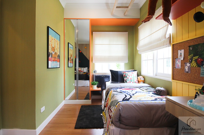 เมื่อวางเตียงนอนและโต๊ะทำงานแล้ว ก็จะยังเหลือพื้นที่ยืนแต่งตัวหน้าตู้เสื้อผ้าอีกเยอะ แค่อาจจะต้องเลื่อนเก้าอี้นิดหน่อยนะ ส่วนบริเวณโต๊ะทำงานก็มีพื้นที่เพียงพอสำหรับเด็ก 2 คนแล้ว