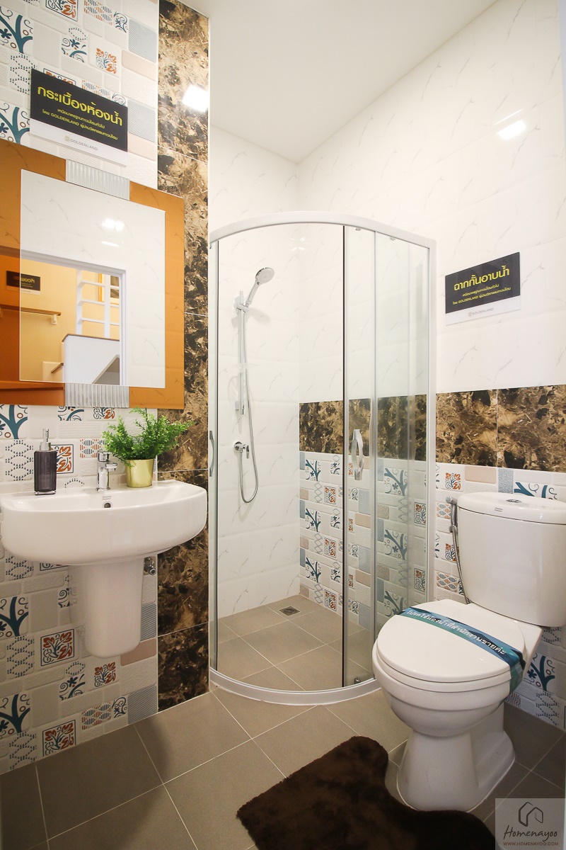 เราเข้าไปดูภายในห้องน้ำชั้นล่างกันต่อค่ะ ห้องน้ำชั้นล่างจะอยู่บริเวณพื้นที่ใต้บันไดจะเป็นห้องน้ำสำหรับแขกด้วย ส่วนผนังกรุด้วยกระเบื้องขนาด 60 x 60 ซม.พร้อมกระเบื้องตกแต่งลายต่าง ๆ ส่วนสุขภัณฑ์จะใช้ของ American Standard ทั้งหมด