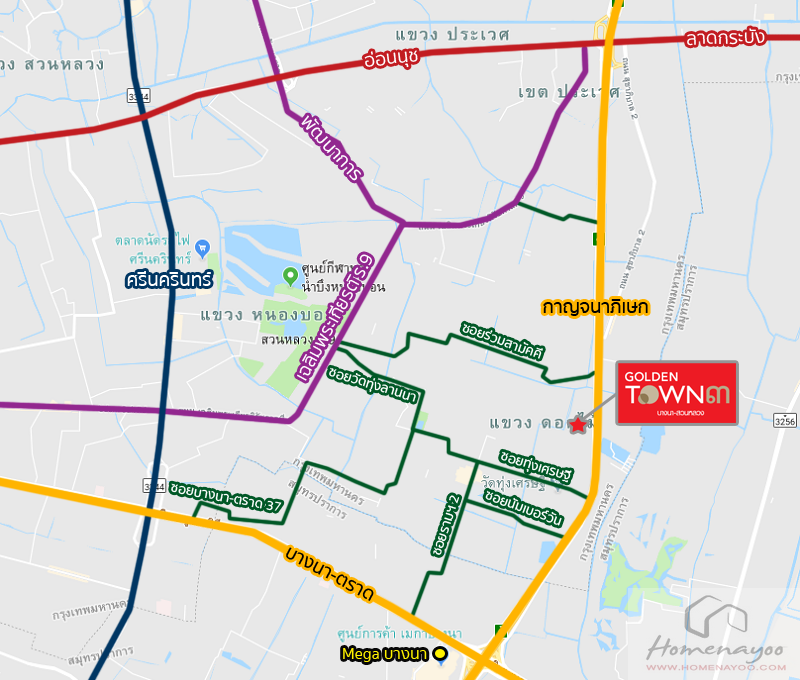 สวัสดีผู้อ่านชาว Homenayoo ทุกท่านครับ วันนี้พวกเราขอพาทุกท่านไปรีวิวกันที่โครงการ Golden Town 3 บางนา-สวนหลวง บ้านทาวน์โฮมคุณภาพจาก Goldenland ตัวโครงการตั้งอยู่ติดถนนกาญจนาภิเษก หรือถนนวงแหวรอบนอกฝั่งตะวันออก ใกล้เมกะบางนา, อีเกียบางนา และสนามบินสุวรรณภูมิ เดินทางสะดวกด้วยทางด่วนถึง 3 สายทั้งทางด่วนบูรพาวิถี, ทางด่วนมอเตอร์เวย์ และทางด่วนกาญจนาภิเษก