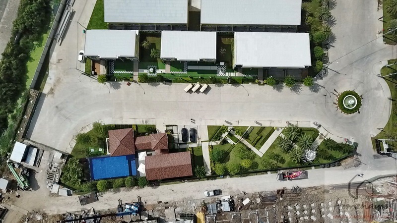 ภาพมุมสูงบริเวณสวนพักผ่อน, คลับเฮ้าส์, สำนักงานขาย และ บ้านตัวอย่าง