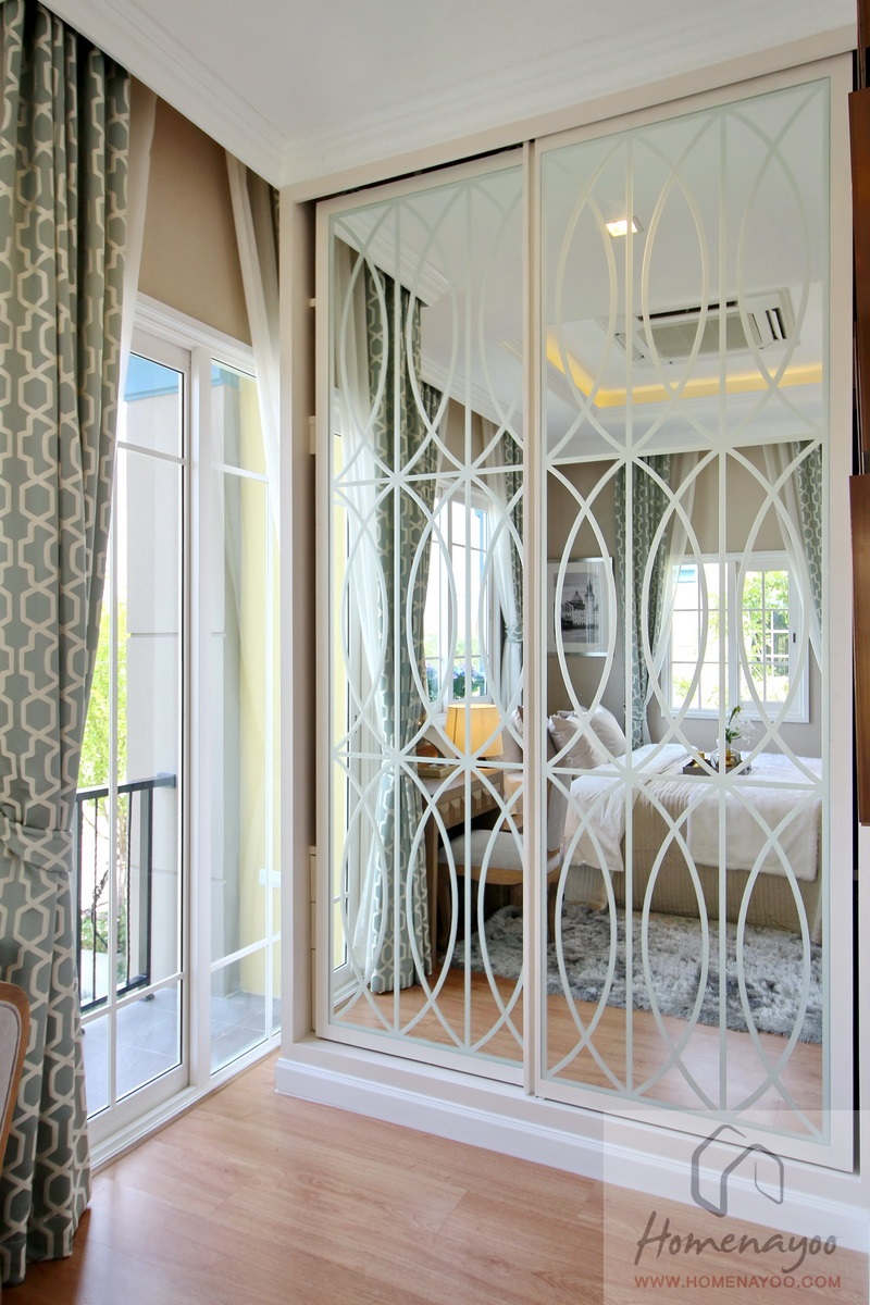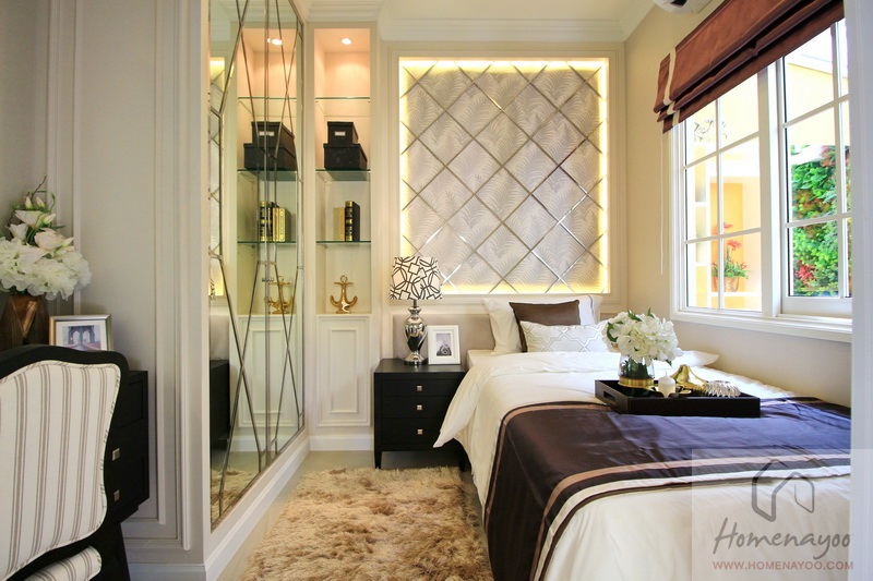 ผนังด้านในสุดบิวท์อินตู้เสื้อผ้าขนาดใหญ่ ความกว้างพอดีผนัง สามารถเลือกเฟอร์นิเจอร์อื่น ๆ มาจัดวางได้ตามชอบ