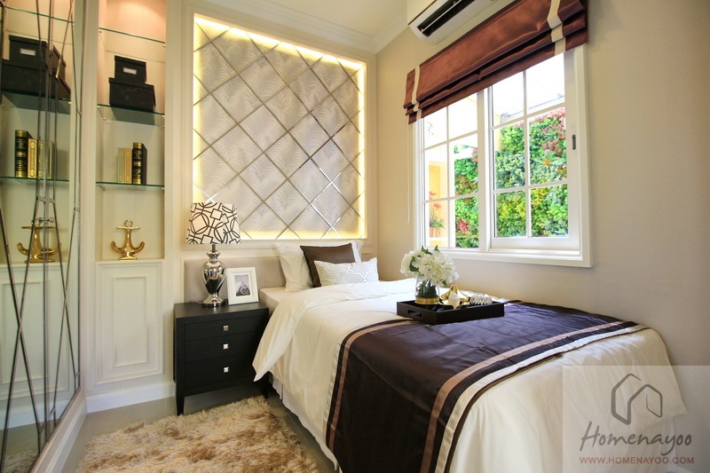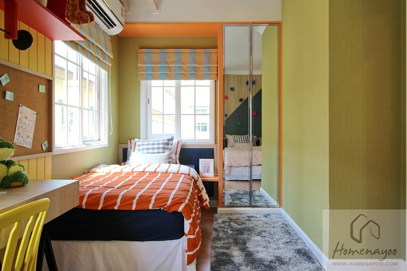 อีกฝั่งตกแต่งในสไตล์เดียวกันโดยวางเตียง 3.5 ฟุต ชิดผนังห้อง ข้างเตียงบิวท์อินตู้เสื้อผ้าให้ดูเป็นแนวทาง