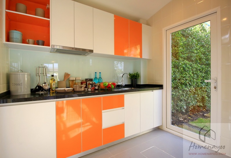 บ้านตัวอย่างบิวท์อินเคาน์เตอร์ครัวแนวยาว ความกว้าง 3.0 x 0.60 เมตร ให้ดูเป็นแนวทาง
