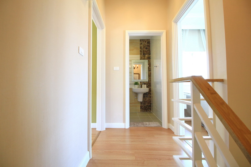 โถงบันไดอยู่ตรงหน้าบ้าน ติดกับพื้นที่สำหรับวางทีวี โครงสร้างบันได คสล. หน้าบันไดไม้ยางพาราประสานสีอ่อน ลูกตั้งบันไดสีขาว มาตรฐานเดียวกันทั้งโครงการ ผนังด้านข้างมีหน้างต่างช่องแสงให้ 1 บาน