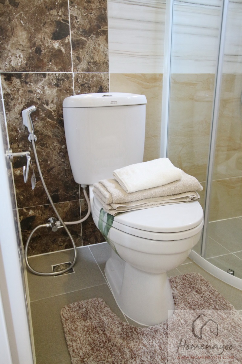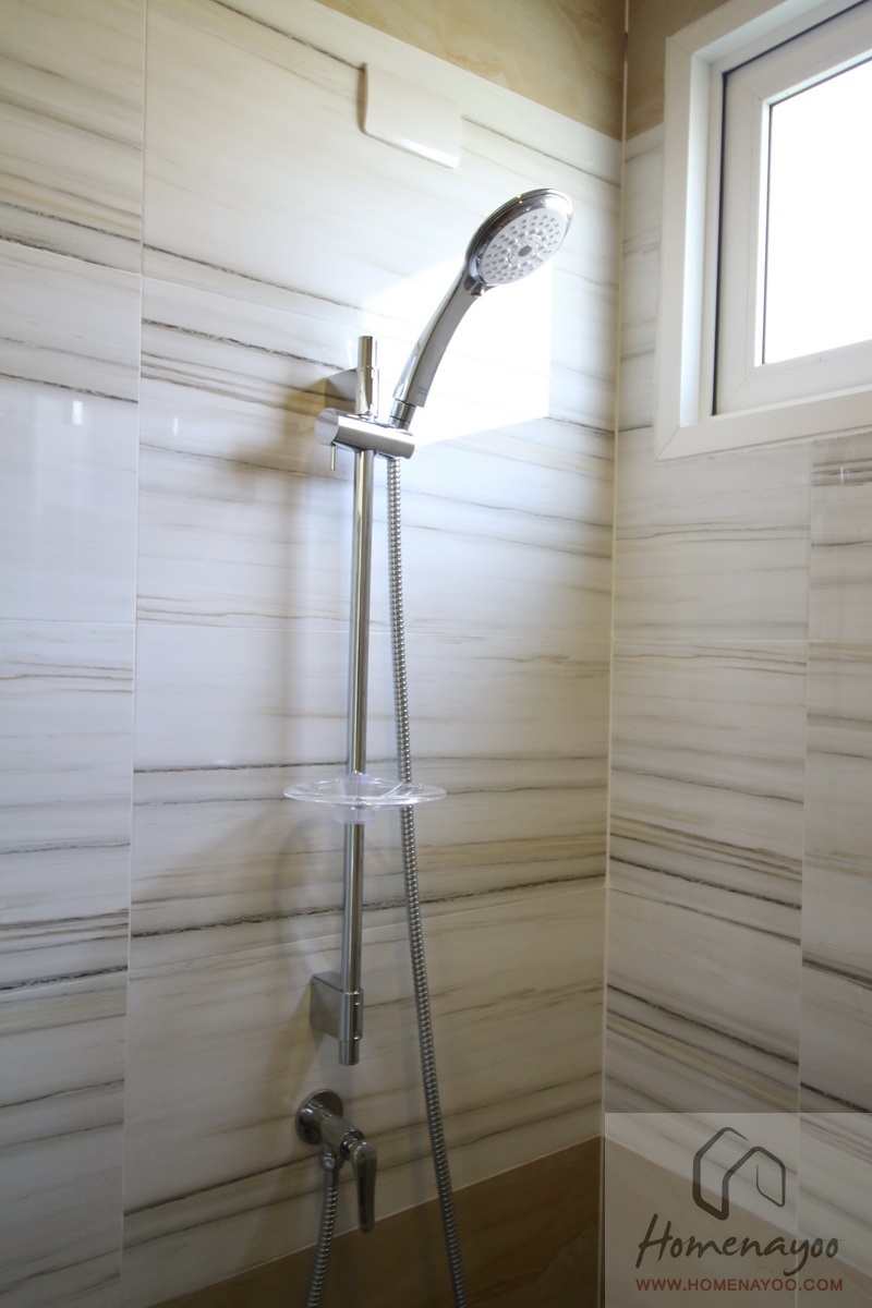 ฝักบัว Hand Shower ก๊อกน้ำโครเมียมก้านโยก พร้อมราวปรับระดับ-ที่วางสบู่ให้ครบชุด ผนังด้านบนเดินงานระบบ รองรับการติดตั้งเครื่องทำน้ำอุ่นให้พร้อมใช้งาน