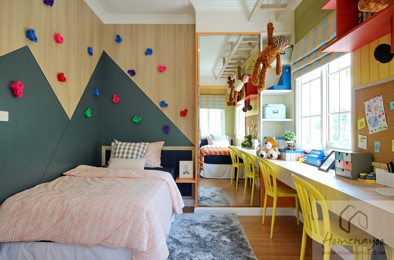 ข้างเตียงบิวท์อินตู้เสื้อผ้า + ชั้นวางของ ติดกันเป็นโต๊ะทำการบ้านของเด็ก ๆ