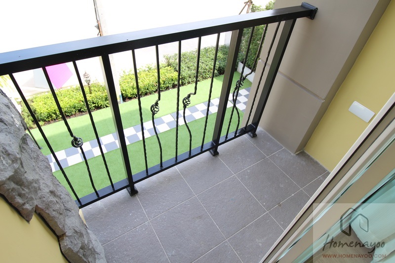 ระเบียงพักผ่อนปูพื้นกระเบื้องเซรามิกกันลื่น 30 x 30 ซม. มีพื้นที่ใช้งาน ขนาด 2.0 x 0.80 เมตร พร้อมติดตั้งราวกันตกเหล็กดัดทาสีดำกันสนิม ความสูง 90 ซม. ให้แบบในภาพ