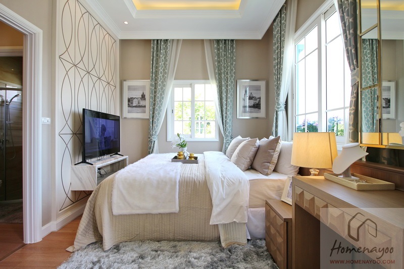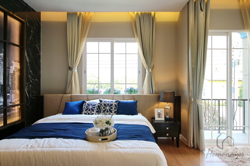 มุมมองเข้าไปภายในห้องนอนใหญ่ ได้ความสูงเพดานที่ 3 เมตร ช่วยให้ห้องดูโปร่งโล่ง มีการแบ่งพื้นที่ห้องออกเป็น 2 โซน คือโซนพักผ่อนและโซน Walk-in closet ตำแหน่งของห้องจะอยู่บริเวณหน้าบ้าน