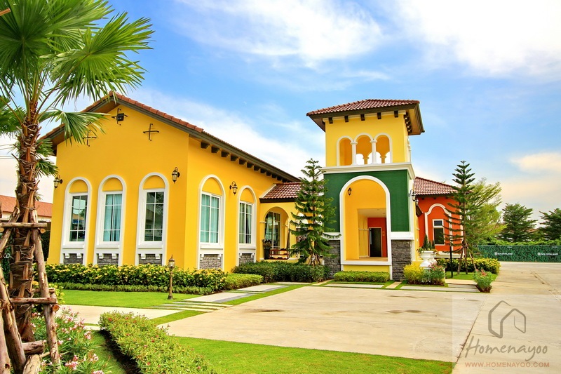 Main Gate โครงการขนาดใหญ่ ตกแต่งสถาปัตยกรรมแบบอิตาลี เข้ากับคอนเซ็ปต์ของโครงการ ผนังซุ้มประตู, ป้อมรปภ. และ ป้ายชื่อโครงการ ใช้โทนสีเหลืองสด ตกแต่งลายอิฐบางส่วน ตัดบัวและเส้นสายสีขาว รับกับสวนสีเขียวด้านข้าง เข้ากับธรรมชาติอย่างลงตัว