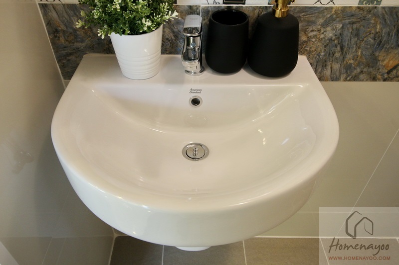 เข้ามาด้านในห้องน้ำ ปูพื้นกระเบื้องเซรามิกกันลื่น 30 x 30 ซม. ผนังกรุแกรนิตโต้ 60 x 60 ซม. สลับกระเบื้องเซรามิกลายวินเทจ พร้อมติดตั้งสุขภัณฑ์ของ American Standard ให้ตำแหน่งตามภาพ