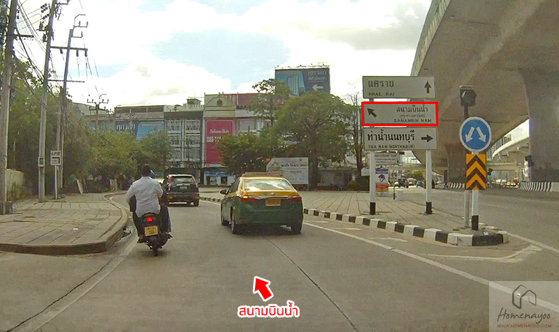 เมื่อลงสะพานมาให้เลี้ยวซ้ายไปยังสนามบินน้ำ สังเกตที่สะพานด้านบนหากว่าเราวิ่งทางหลักและขึ้นสะพานสูง นั่นจะทำให้เราเลยทางแยกเข้าสนามบินน้ำตรงจุดนี้ครับ