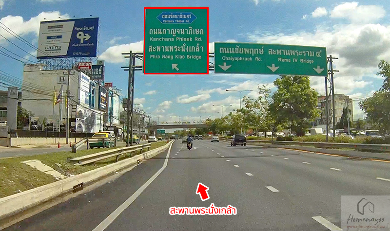 หลังจากที่ขึ้นมาจากอุโมงค์ ให้เราดูป้ายทางออกไปยังสะพานพระนั่งเกล้า ให้เราเบี่ยงซ้ายเพื่อไปวิ่งทางคู่ขนานด้านนอก