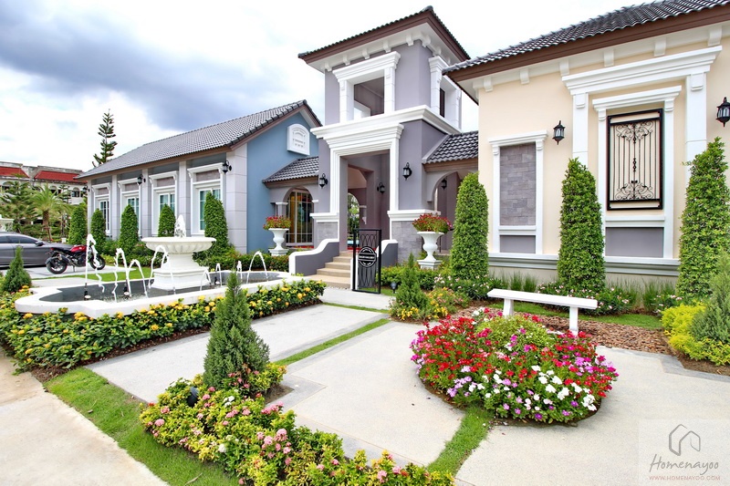 พื้นที่ด้านหน้าตกแต่งสวนด้วยดอกไม้นานาพรรณ พร้อมไม้พุ่มที่ได้รับการตัดแต่งอย่างสวยงามเป็นระเบียบ