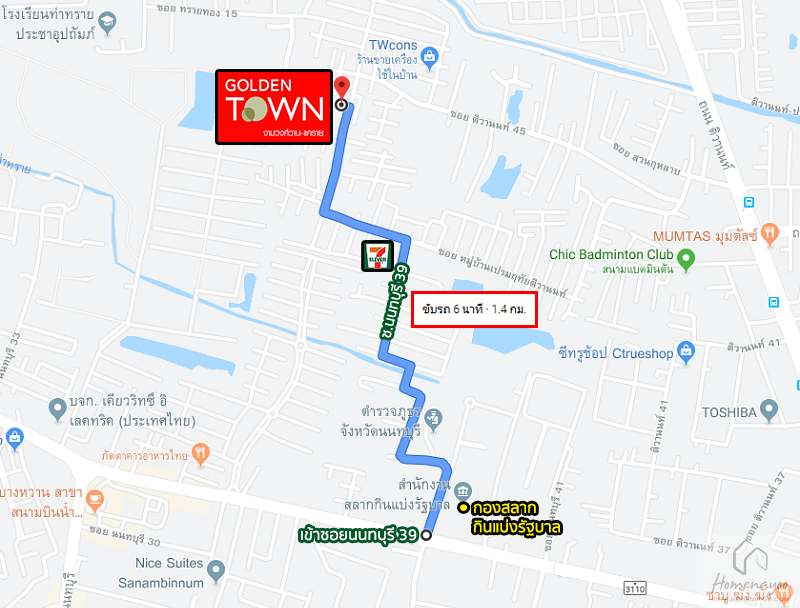 สวัสดีผู้อ่านชาว Homenayoo ทุกท่านครับ วันนี้เราจะขอนำทุกท่านไปรีวิวกันที่โครงการ Golden Town งามวงศ์วาน-แคราย ของทาง Goldenland กันครับผม ตัวโครงการตั้งอยู่ภายในซอยนนทบุรี 39 หรือเข้าทางติวานนท์ 45 ก็ได้ ใกล้ถนนใหญ่ และทางด่วน ทั้งยังอยู่ไม่ไกลจากแนวเส้นทางรถไฟฟ้าสายสีม่วง และสายสีชมพูในอนาคต รายล้อมด้วยแหล่งอำนวยความสะดวกมากมายเช่น เดอะมอลล์ งามวงศ์วาน, บิ๊กซี, โลตัส, เอสพลานาด และเซ็นทรัลพลาซา แจ้งวัฒนะ