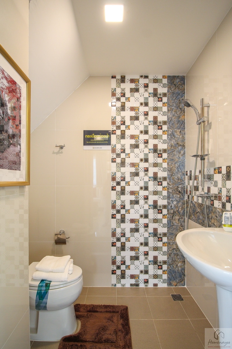 ห้องน้ำชั้น 2 การตกแต่งกระเบื้องภายในห้องน้ำคุมโทนเดียวกัน วัสดุและสุขภัณฑ์ต่าง ๆ ได้มาเหมือนกับห้องน้ำชั้นล่างทุกประการค่ะ