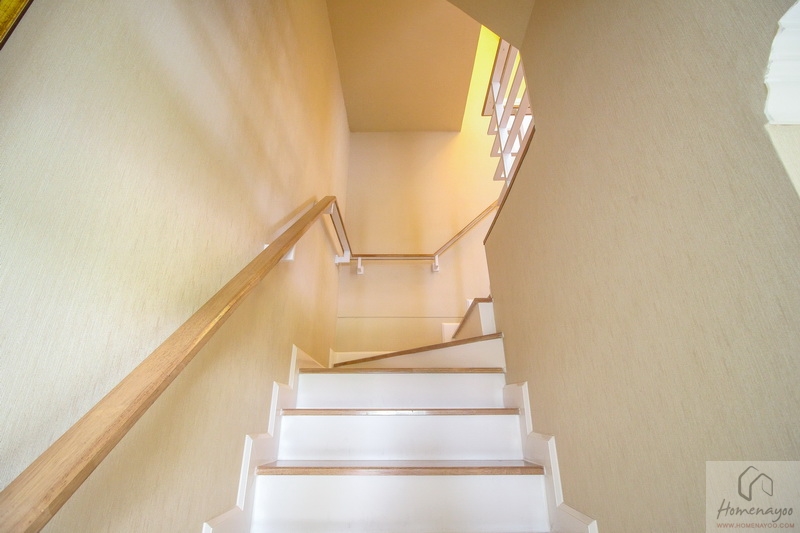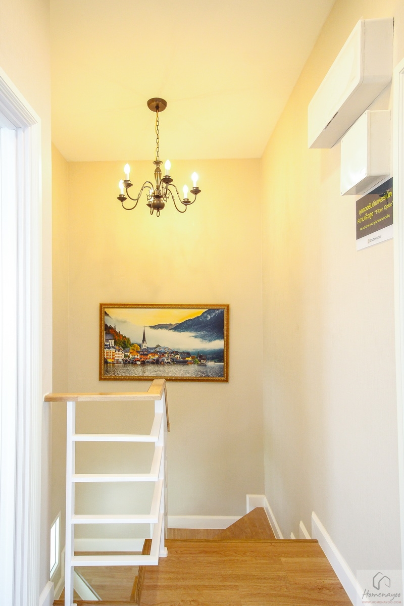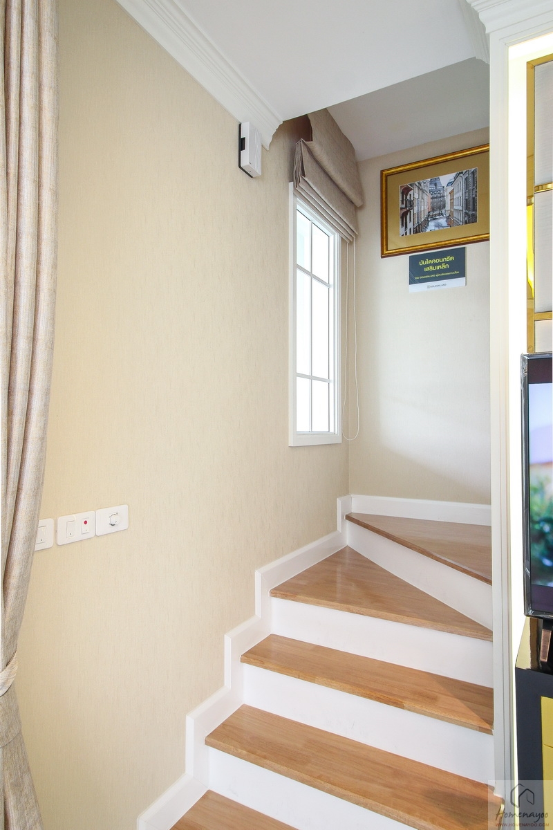 โถงบันไดอยู่ตรงหน้าบ้าน ติดกับพื้นที่สำหรับวางทีวี โครงสร้างบันได คสล. หน้าบันไดไม้ยางพาราประสานสีอ่อน ลูกตั้งบันไดสีขาว มาตรฐานเดียวกันทั้งโครงการ ผนังด้านข้างมีหน้างต่างช่องแสงให้ 1 บาน