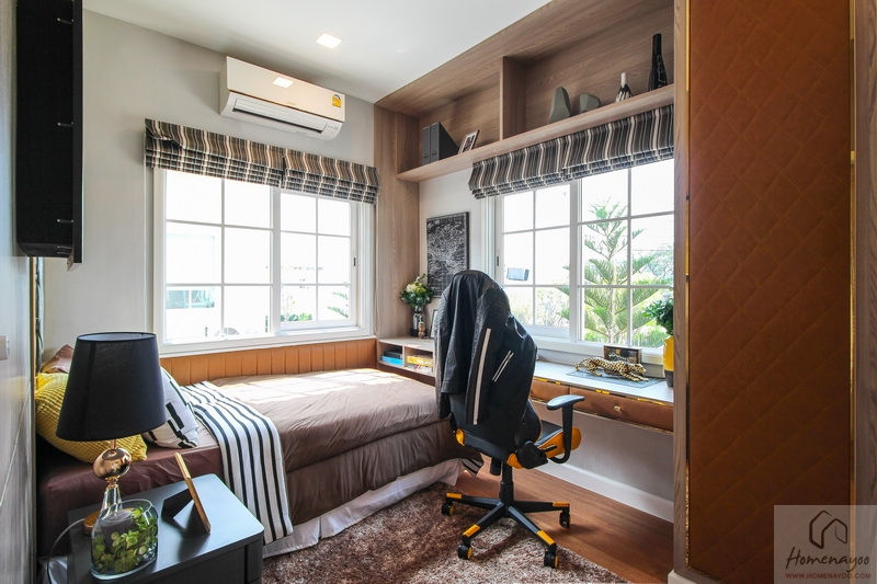 เริ่มกันที่ห้องนอน 2 บ้านตัวอย่างตกแต่งเป็นห้องนอนเด็กผู้ชาย พื้นที่ใช้งานขนาดขนาดกำลังพอดี สามารถวางเตียงนอน ขนาด 3.5-5 ฟุต รวมถึงเฟอร์นิเจอร์มาตรฐานได้ครบชุด