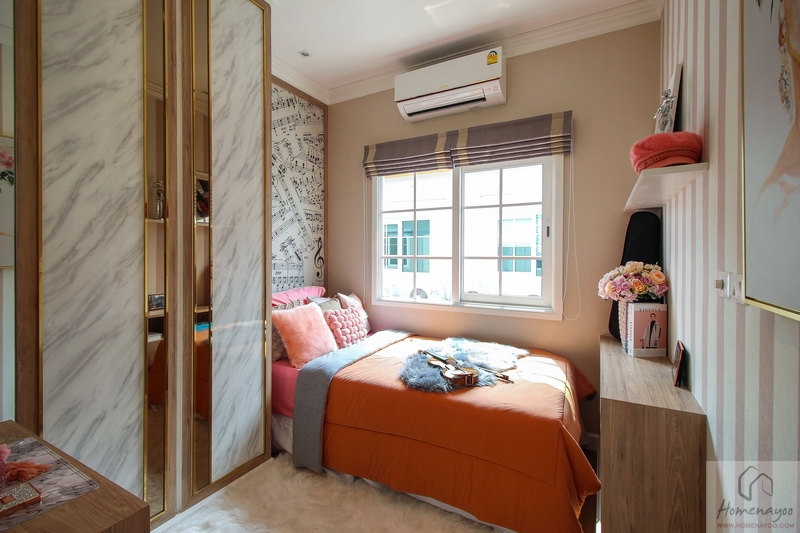 มาต่อกันที่ห้องนอน 3 เป็นส่วนสุดท้ายกันค่ะ เข้ามาด้านในตกแต่งเป็นห้องนอนผู้หญิงในโทนสีสว่าง วางเตียงนอน 3.5 ฟุต ชิดผนังด้านใน รองรับเฟอร์นิเจอร์มาตรฐานได้ครบเซ็ต ผนังด้านหลังห้องมีหน้าต่างกระจกบานเลื่อน กรอบ UPVC ขนาด 1.5 x 1.10 เมตร ให้ 1 บาน