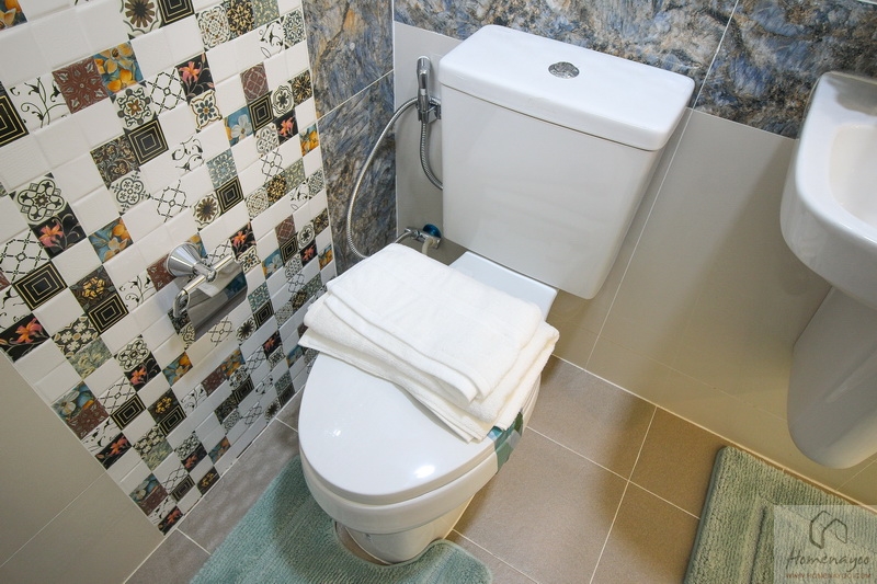 ตรงข้ามเป็นโถสุขภัณฑ์แบบ 2 Piece ระบบ Dual Flush พร้อมสายชำระ และ ที่แขวนกระดาษทิชชู่สแตนเลส
