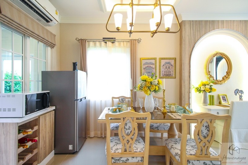 มุมรับประทานอาหาร วางโต๊ะทานข้าว + เก้าอี้ ขนาด 4 ที่นั่ง ให้ดูเป็นไอเดีย ระยะใช้งานรอบโต๊ะทานอาหาร กว้างกำลังดี เลื่อนเก้าอี้-เดินเข้า-ออกได้อย่างสะดวก และ ที่ด้านข้างก็ยังสามารถทำเป็นมุมทำงานแบบ Work From Home หรือ มุมทำการบ้านของเด็ก ๆ ได้ด้วย