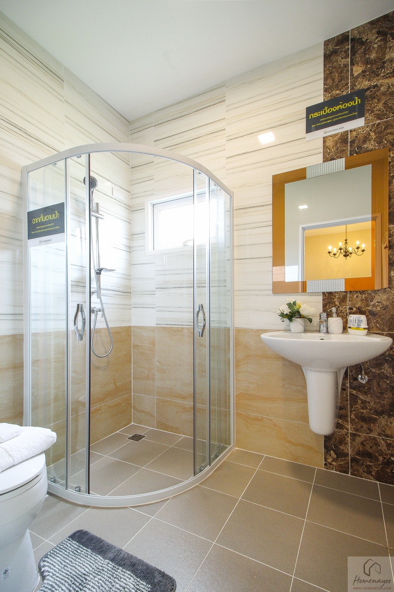ฝักบัว Hand Shower พร้อมราวปรับระดับ + ที่วางสบู่ ก๊อกน้ำโครเมียมก้านโยก ผนังเดินงานระบบ Junction Box มาให้พร้อมต่อใช้งาน ส่วนบ้านแปลงมุมจะมีหน้าต่างกระจกฝ้าบานกระทุ้งให้ 1 บาน