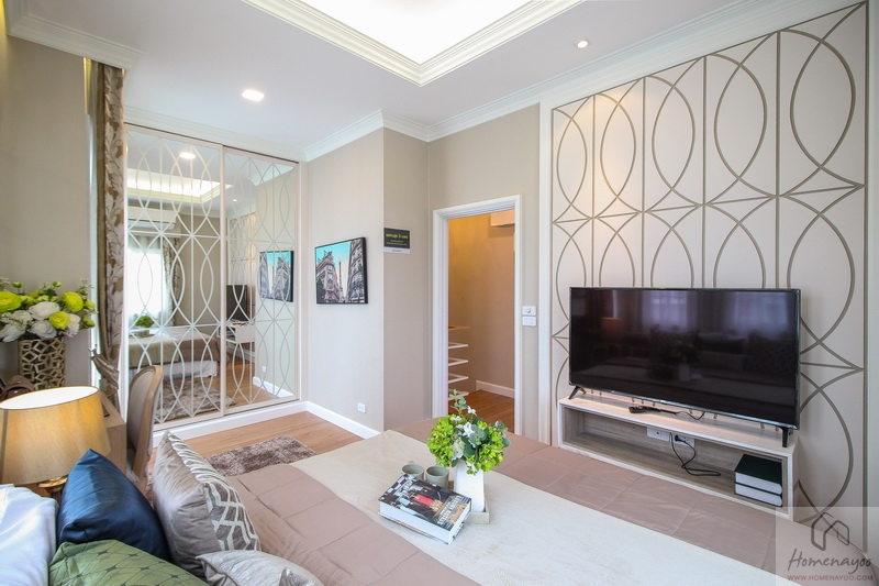 ขวามือเป็นมุมพักผ่อน วางเตียงนอน ขนาด 6 ฟุต ปลายเตียงบิวท์อิน Sideboard ที่ผนังให้ดูระยะใช้งาน บ้านจริงเดินงานระบบไฟฟ้า เต้าเสียบปลั๊กไฟ และ ช่องเสียบสายเคเบิลให้เรียบร้อย