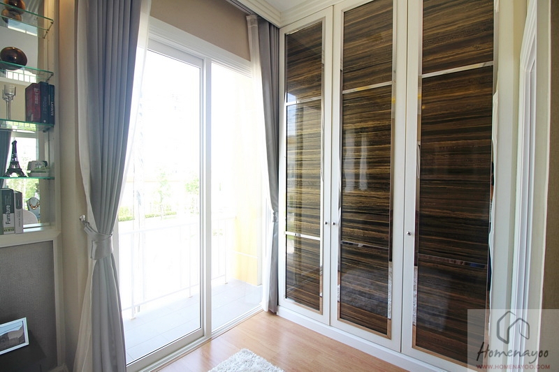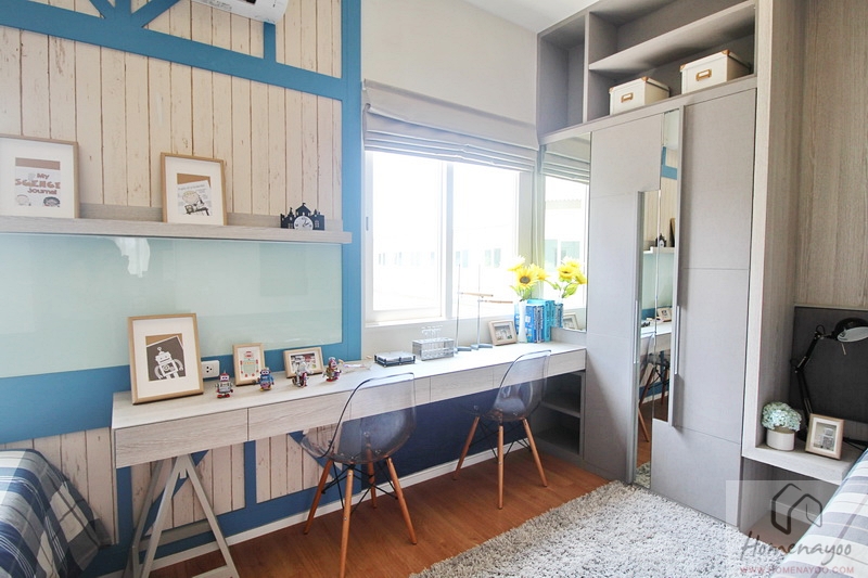 ข้างโต๊ะทำงาน หรือตรงข้ามกับประตูห้องจะเป็นมุมแต่งตัว วางตู้เสื้อผ้าใบใหญ่ได้
