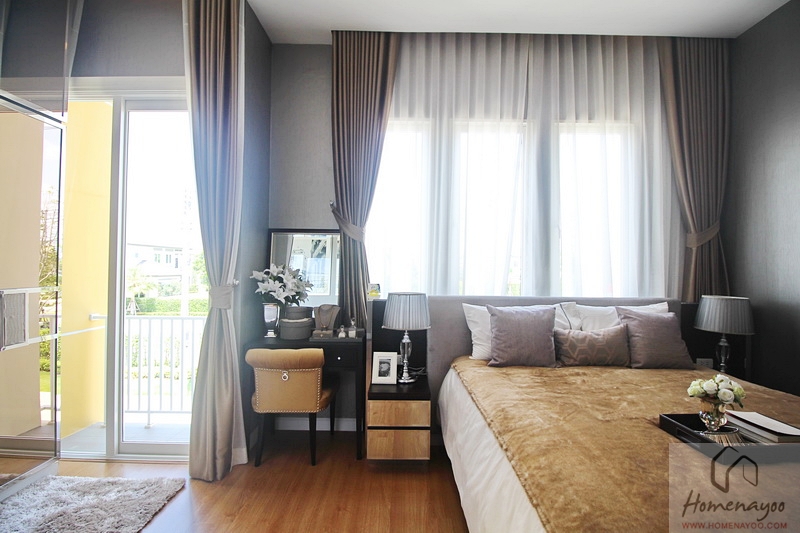 เข้ามาด้านในห้องนอนขนาดจะใหญ่เพราะกินพื้นที่ด้านหน้าของบ้านทั้งหมด มีหน้าต่างกระจกและระเบียงส่วนตัวที่ประตูเป็นประตูกระจก กรอบหน้าต่างเป็นอลูมิเนียมสีขาว กระจกเขียวตัดแสง
