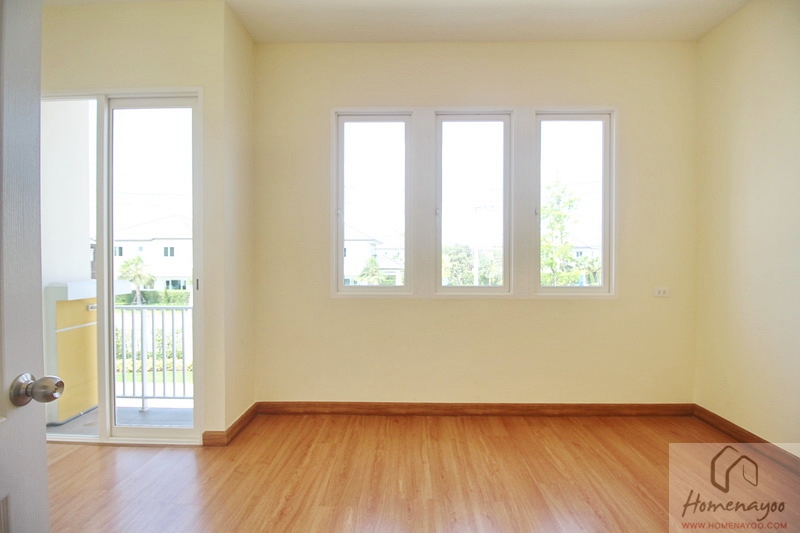 เข้ามาด้านในห้องนอนขนาดจะใหญ่เพราะกินพื้นที่ด้านหน้าของบ้านทั้งหมด ในห้องสว่างกว่าห้องเมื่อกี้เพราะมีหน้าต่างกระจก 2 บานและระเบียงส่วนตัวที่ประตูเป็นประตูกระจก กรอบหน้าต่างเป็นอลูมิเนียมสีขาว กระจกเขียวตัดแสง