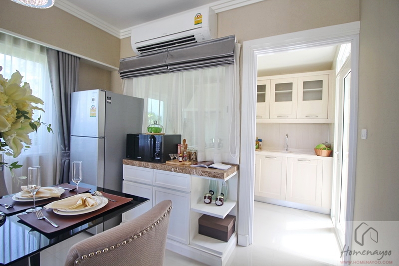 ติดกันนั้นเป็นโต๊ะทานอาหารและครัว ส่วนห้องด้านขวามือจะเป็นห้องนอน 4 สำหรับบ้านตัวอย่างได้ทำการต่อเติมส่วนหลังบ้านให้เป็นครัว ดังนั้นจึงมีพื้นที่ว่างระหว่างโต๊ะทานอาหารกับโซฟา สามารถวางเป็นมุมโต๊ะทำงานได้