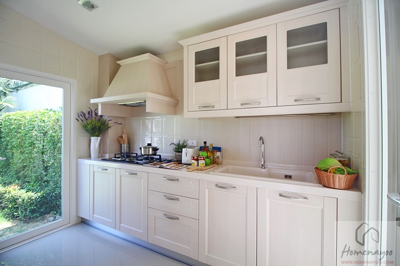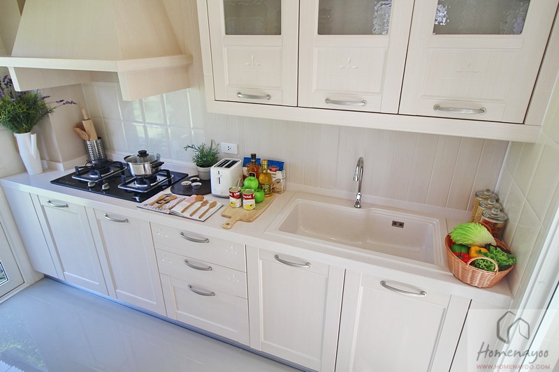 บ้านตัวอย่างทำเป็นห้องครัวซึ่งจะเห็นเลยค่ะว่าทำเป็นครัวใหญ่ได้เลย ก็ทำได้พื้นที่ด้านบนและล่างเคาน์เตอร์ก็ทำเป็นชั้นวางของ ตู้เก็บของซึ่งจะสามารถเก็บของได้เยอะทีเดียว