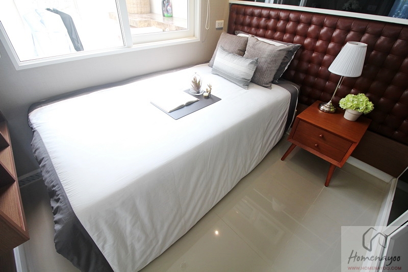 ข้างเตียงมีหน้าต่างกระจก ทำให้มีแสงธรรมชาติส่องเข้ามาตรงนี้ ปลายเตียงอาจวางชั้นวางของหรือถ้าไม่ว่างก็จะให้มีพื้นที่ปลายเตียงเหลือและทำให้ปูผ้าปูที่นอนได้สะดวก