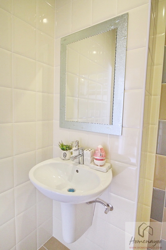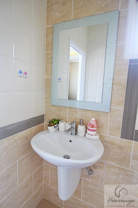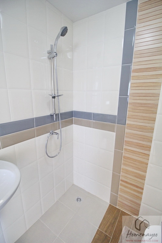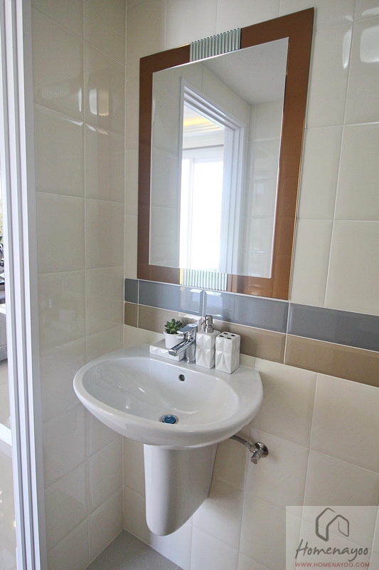 ห้องน้ำพื้นลดระดับลงไปอีกเล็กน้อย กระเบื้องเป็นเซรามิคสีน้ำตาลอ่อนขนาด 30×30 ซม. เข้ามาในห้องน้ำจะดูกว้าง มีส่วนอาบน้ำโดยห้องนี้ไม่ได้แยกส่วนแห้งและเปียกชัดเจน