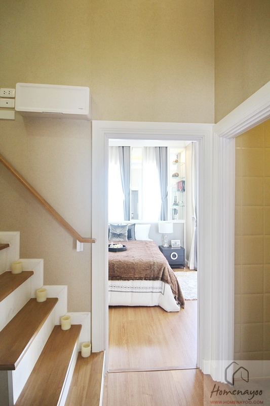 ชั้นบนเป็นห้องนอนทั้งหมดมี 2 ห้องนอน โดยขนาดห้องนอนทั้ง 2 นั้นใกล้เคียงกันเป็นห้องนอนใหญ่ เพียงแต่ห้องนอน 1 นั้นจะมีระเบียงส่วนตัว สำหรับห้องนอน 2 สามารถวางเตียง 5 ฟุต หรือ 3.5 ฟุต 2 เตียง ทำเป็นห้องสำหรับ 2 คนได้ มีพื้นที่วางเฟอร์นิเจอร์อื่นๆทั้งตู้เสื้อผ้า โต๊ะทำงาน สำหรับห้องนอน 1 หรือ Master bedroom นั้นได้แสงธรรมชาติและดูโปร่งเพราะมีหน้าต่างกระจกและประตูระเบียงกระจกบานใหญ่ค่ะ โดยชั้นนี้จะมีห้องน้ำ 1 ห้องโดยห้องนอนใหญ่และห้องนอน 2 จะใช้ร่วมกันค่ะ